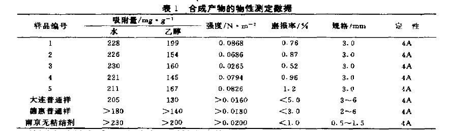 從測定結(jié)果來看,以高嶺土為原料合成的無粘結(jié)劑4A分子篩的吸附容量超過了市售普通分子篩,抗碎強度遠高于普通分子篩的3倍以上,磨損率低于普通分子篩。用這種方法合成的分子篩,由于不舍粘結(jié)劑,有效成分高,吸附容量大,并且這種分子篩成型體的結(jié)構(gòu)組織,在反應(yīng)過程中發(fā)生變化,形成牢固的一體,因而其強度得到提高,磨損率小。